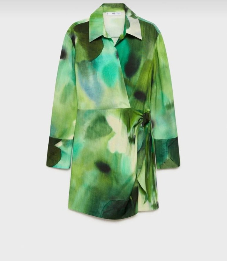 Yeşil uzun kollu, bağlamalı, salaş kesim mini elbise yakalı ve batik desenli, yumuşak sentetik kumaştan yapılmıştır.