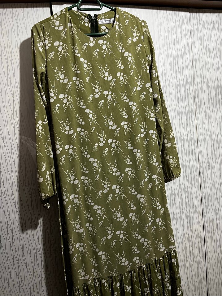 Uzun, koyu yeşil renkli, drapeli ve uzun kollu bu elbise, yuvarlak yakaya ve baskılı desene sahiptir. Yumuşak sentetik kumaştan yapılmış, minimalist bohem stile uygundur.
