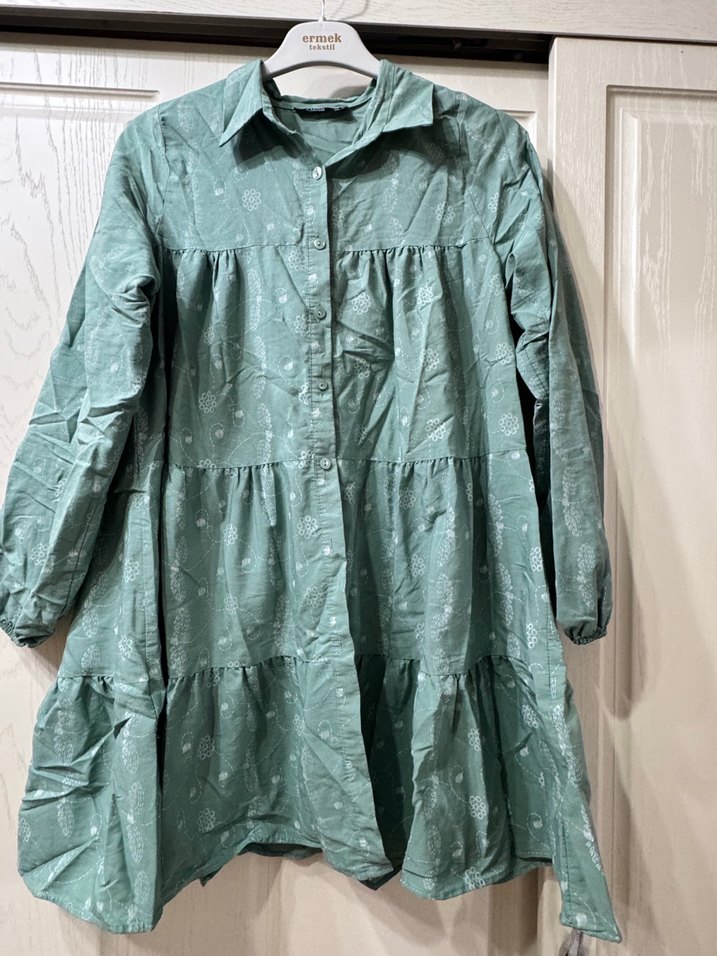 Parlak yeşil keten kumaştan, uzun kollu, düğmeli, yakalı ve bol kesim bohem desenli uzun tunik.
