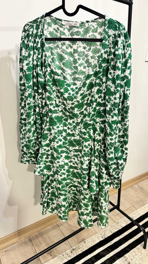 Yeşil renkli, çiçek desenli, uzun kollu ve V yakalı bu elbise, dökümlü yapısı ve bol kesimiyle bohem tarzını yansıtıyor. Uzun boyda, yumuşak sentetik kumaştan üretilmiştir.