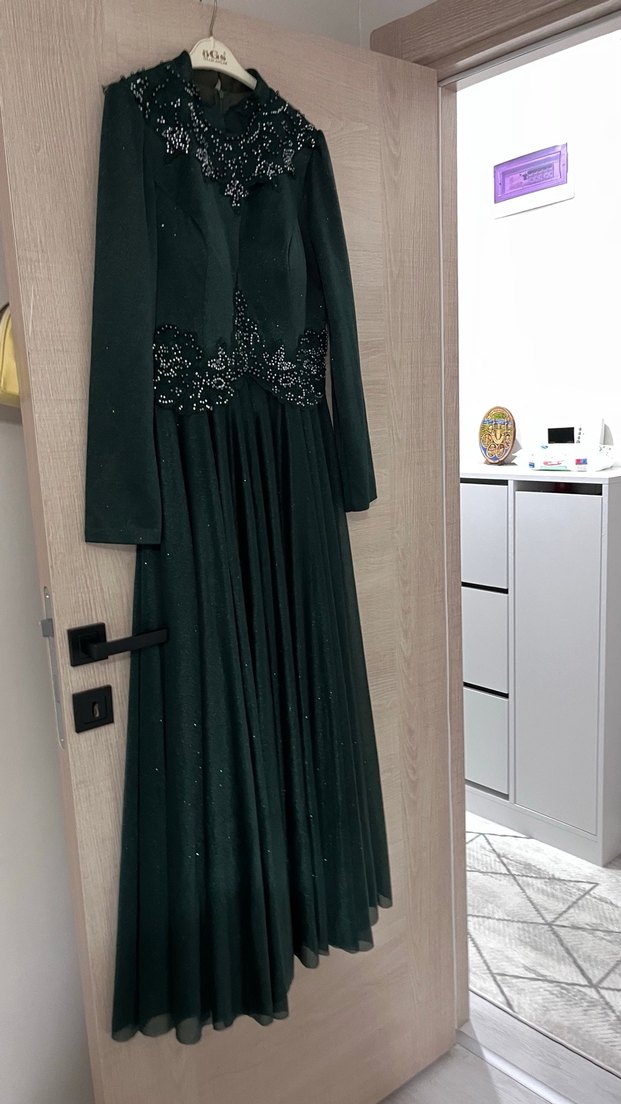 Drapeli detaylara sahip, uzun kollu ve yüksek yakalı yeşil abiye elbise. Modern klasik tarzda, düğünler için şık ve göz alıcı bir model.