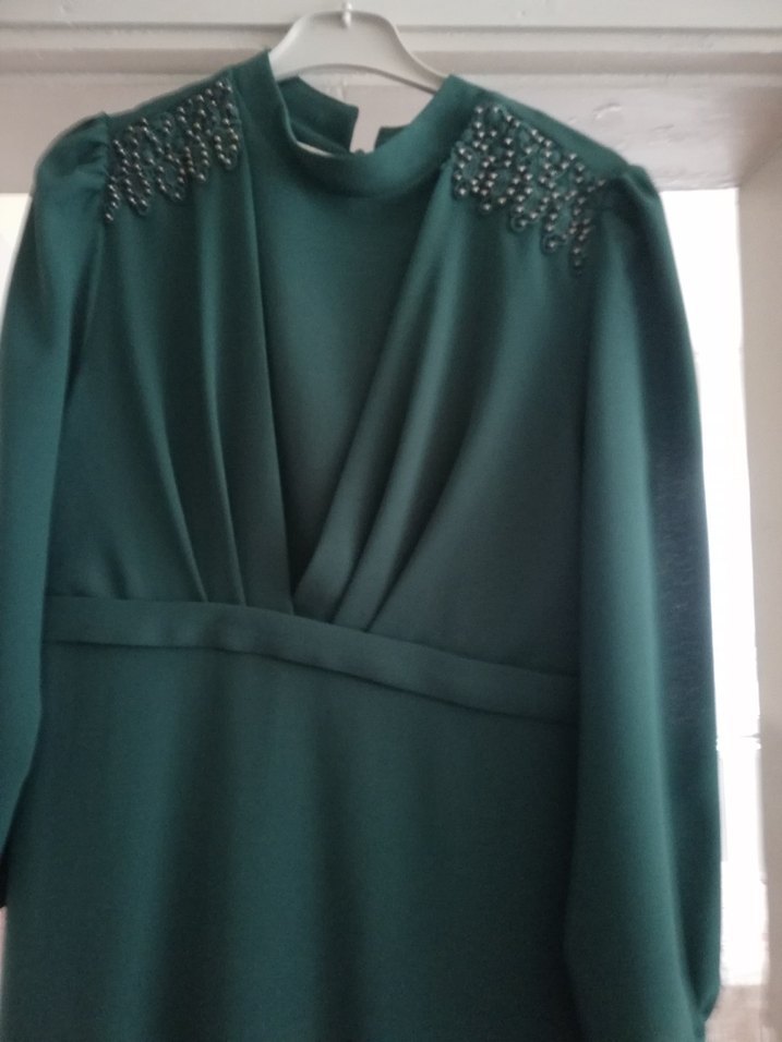 Yüksek yakalı, uzun kollu, drapeli ve parlak yeşil kumaştan yapılmış, klasik kesim uzun abiye elbise. Düz renk ve şık detaylarla düğünler için uygundur.
