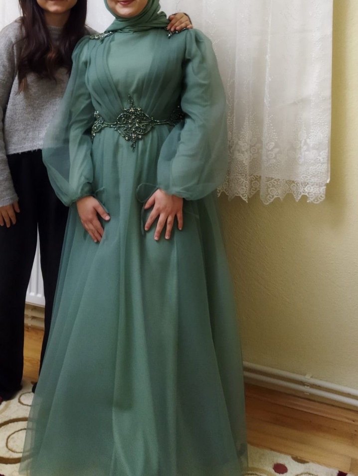 Yeşil renkte, uzun kollu ve drapeli detaylara sahip, bele işlemeli klasik kesim abiye elbise. Sadece sözümde giydim herhangi bir deformesi yoktur boyum bir 150 cm ayagıma topuklu giydim boyunu kendime göre kestirmiştim boyu 150 165 cm olan arkadaşlar için uygun olur