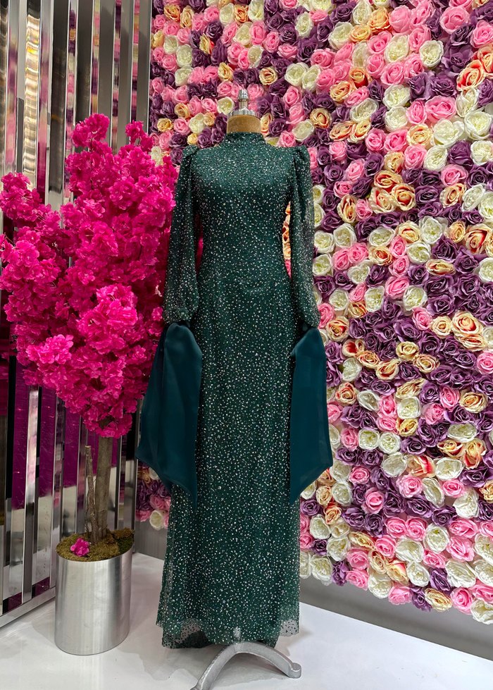Yeşil renkli, uzun kollu ve yüksek yakalı abiye elbise, çiçek desenli ve drapeli tasarıma sahiptir. Klasik zarafetle bohem stili bir araya getirir, düğünler için uygundur. K*r*l*k şal dahil