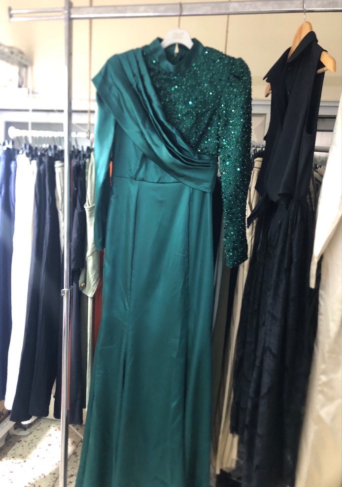 Yeşil Uzun Kollu Drapeli Abiye Elbise tesettür abiye