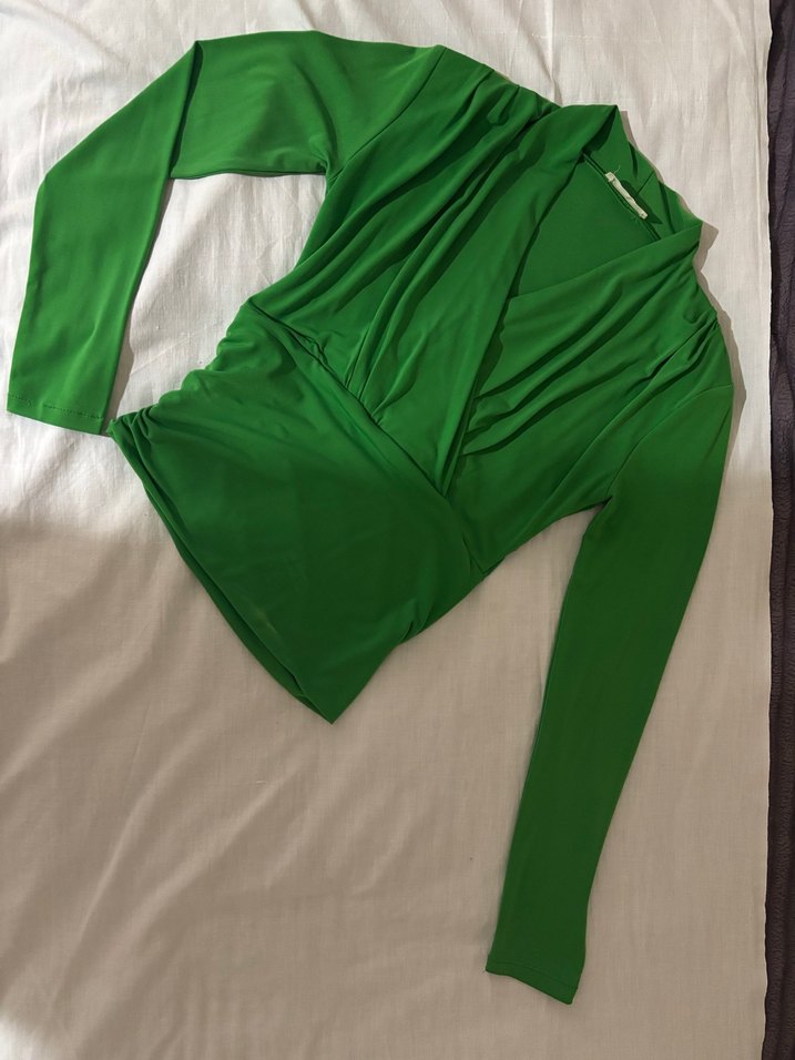 Marka temsilidir, görselde bir kolda küçük bir dikiş söküğü var dikkatli inceleyiniz.Yeşil renkli, uzun kollu ve drapeli tasarıma sahip dar kesim bluz.