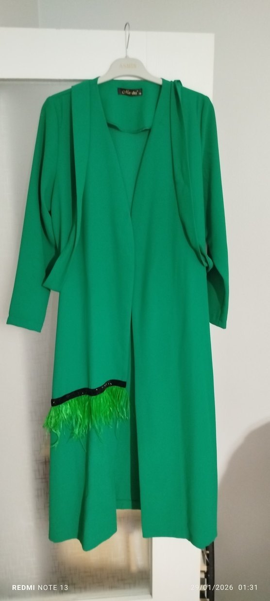 Yeşil renkte, uzun kollu ve yakası açık drapeli kadın elbisesi. Sentetik kumaştan, renkli ve avant-garde tarzda, tüy detaylıdır. Parti için uygundur.