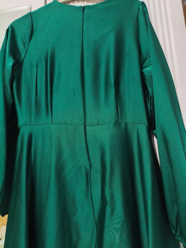 Yeşil, parlak dokulu, ipeksi kumaştan uzun kollu, V yaka ve drapeli tasarıma sahip, modern ve minimal tarzda parti elbisesi.