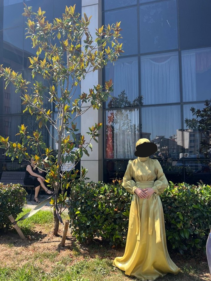 Yesil renkte, uzun kollu, yüksek yakalı ve drapeli tasarıma sahip bol kesim uzun elbise. Vintage tarzda, mütevazı özel dikim baş örtüsü ile birlikte satılır