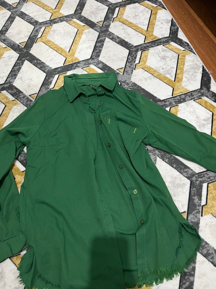 Uzun boylu yeşil gömlek, yakalı ve düğmeli. Uzun kollu, bol kesim, yumuşak sentetik kumaştan, sokak tarzına uygun.