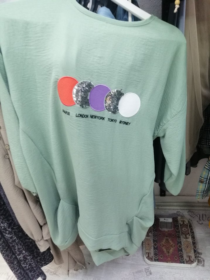 Yeşil pamuklu, uzun kollu, düğmeli, baskılı şehir isimli rahat kesim sweatshirt. Sokak stiline uygun rahat bir model.