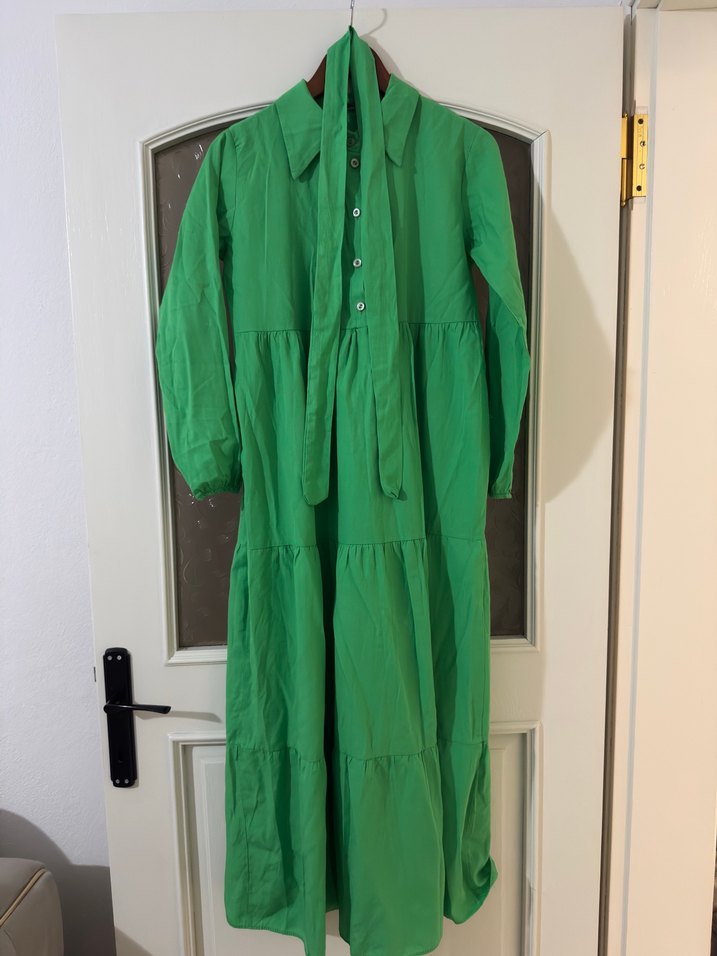 Yeşil keten elbise, uzun kollu, bol kesim ve pileli detaylara sahip. 36 bedene uygun