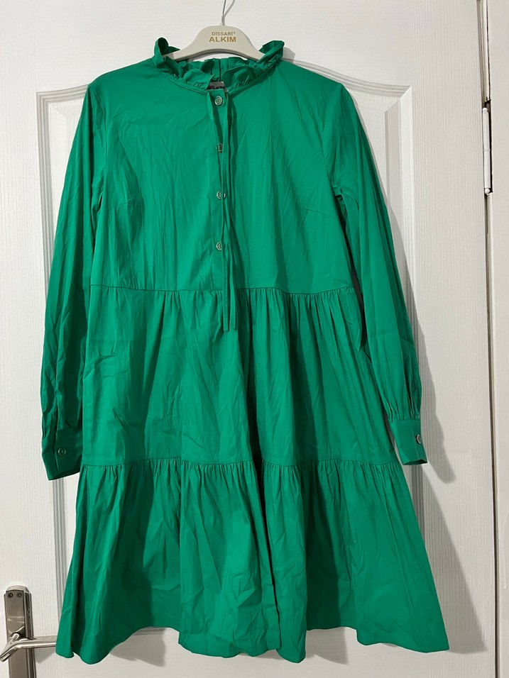 Yeşil uzun kollu, yüksek yakalı ve fırfırlı detaylı bol kesim keten elbise. Parlak kumaşıyla bohem tarzı yansıtır, günlük kullanım için uygundur.