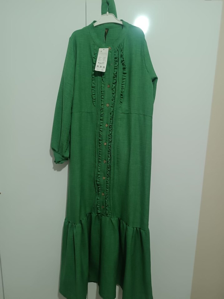 Yeşil renkli, uzun kollu, bol kesim ve bisiklet yaka tasarıma sahip keten elbise. Nakışlı desenler ve fırfır detayları ile bohem tarzı yansıtıyor.