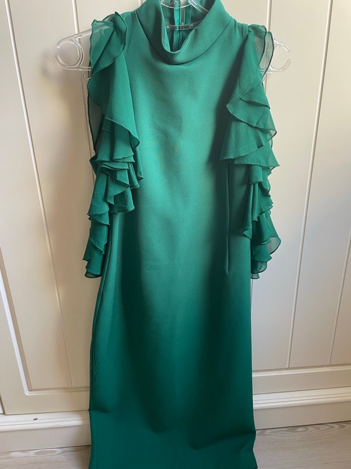 Fırfırlı detaylara sahip, yüksek yakalı ve kolsuz yeşil, uzun boy kadın elbisesi. Parlak dokusu ve modern klasik tarzıyla ofis için uygundur.