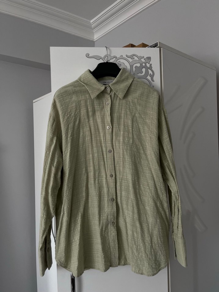 uzun kollu, düğmeli ve yakalı, midi boyda bol kesim gömlek.