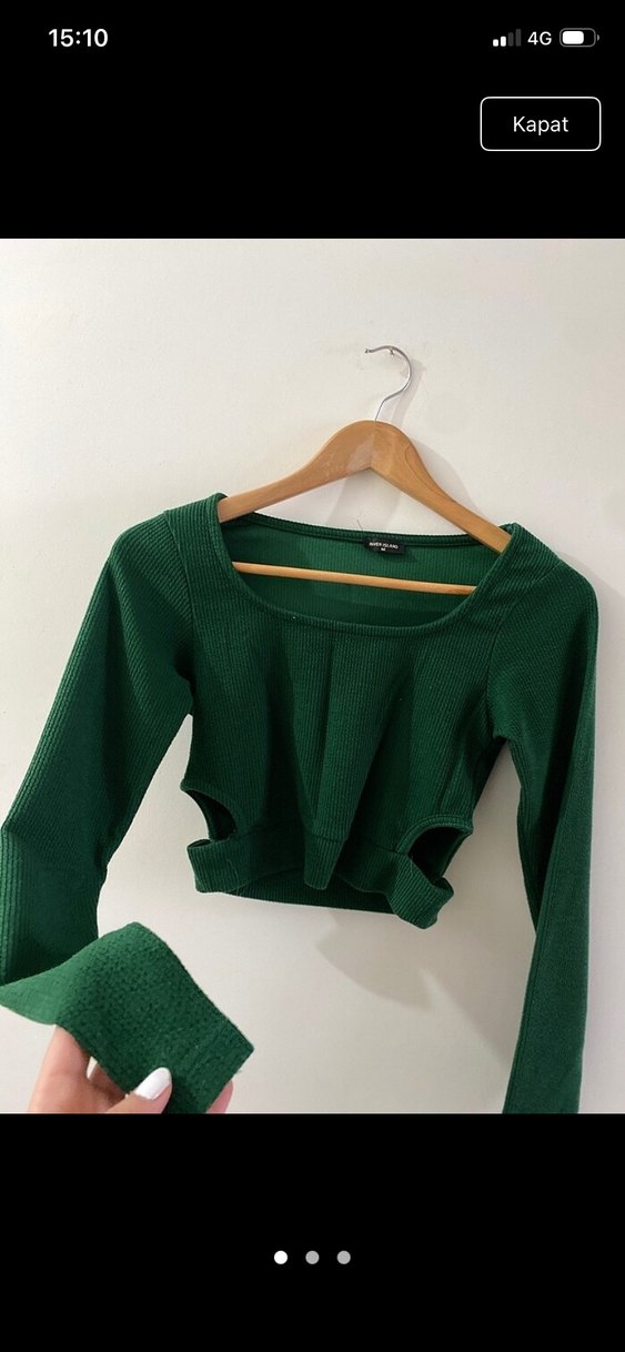Yeşil renkli, yumuşak yün dokusundan üretilmiş, uzun kollu, ince triko bluz. Normal boyda, rahat günlük kullanım için uygundur.