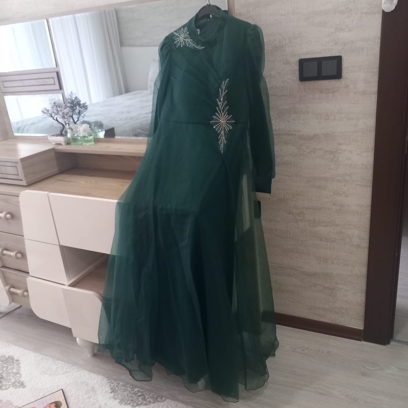 Yeşil renkte, uzun kollu ve yaka kısmı kesik detaylı abiye elbise. Drapeli tasarım ve işlemeli desenlerle süslenmiş, düğünler için uygun mütevazı ve şık bir modeldir. Rahat ve klasik kesimlidir.