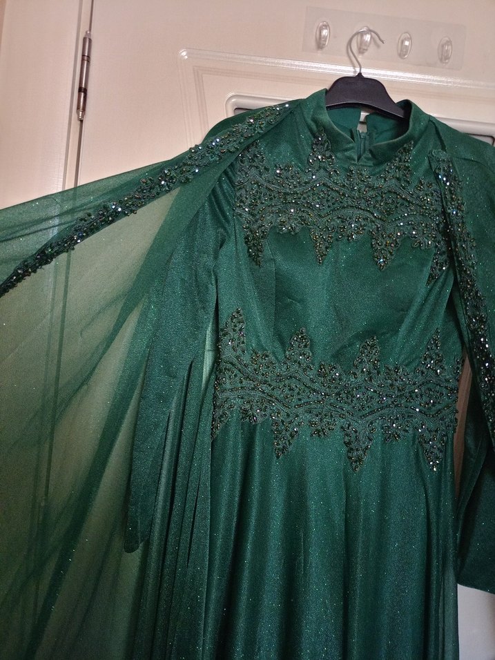 Yeşil uzun kollu abiye elbise, yüksek yakalı ve işlemeli detaylara sahip. Drapeli ve parlak kumaşıyla düğünler için uygundur. sadece fermuarın orda çok ufak sökük var dikilebilir uğraşmadım