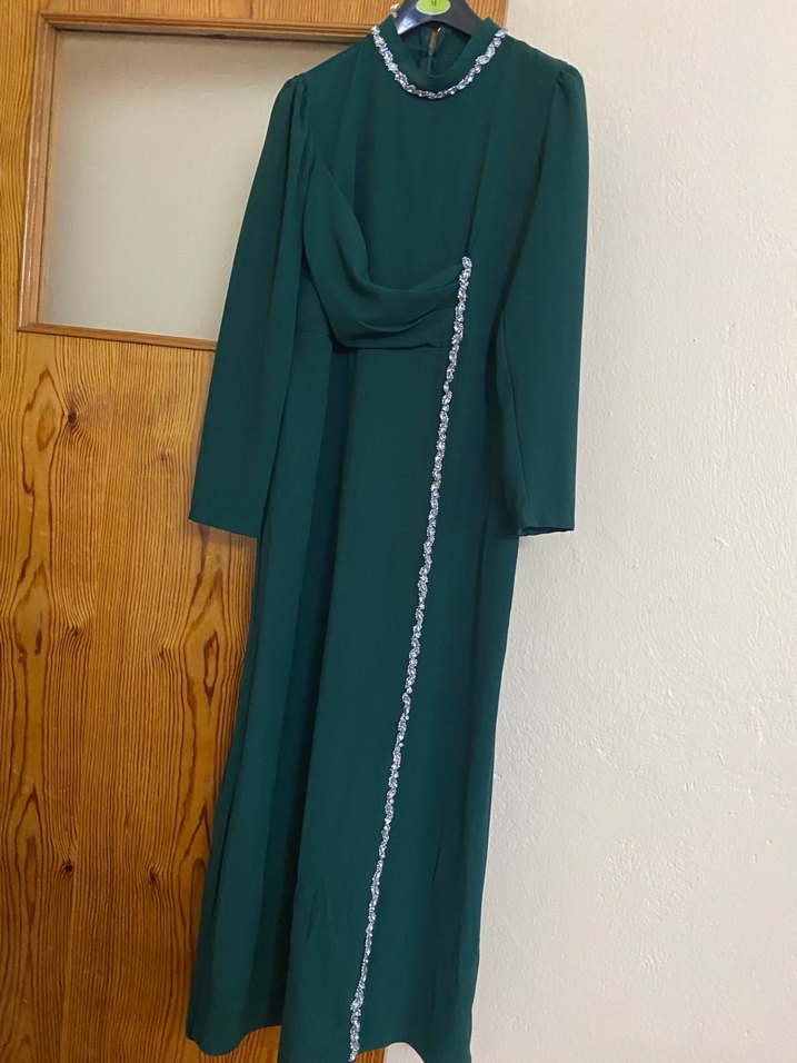 Yeşil renkli, yüksek yakalı ve uzun kollu, drapeli tasarıma sahip uzun elbise. Ön kısmında işlemeli detaylar ve parlak bir görünüm sunar, iş ortamı için uygundur.