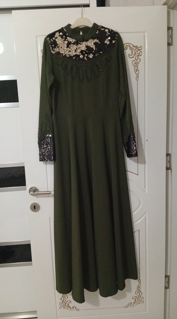 Koyu yeşil uzun kollu, salaş kesim kadın abiye elbise. Üst kısmında ve kollarında payet işlemeleri bulunan, düğün için uygun bir model.