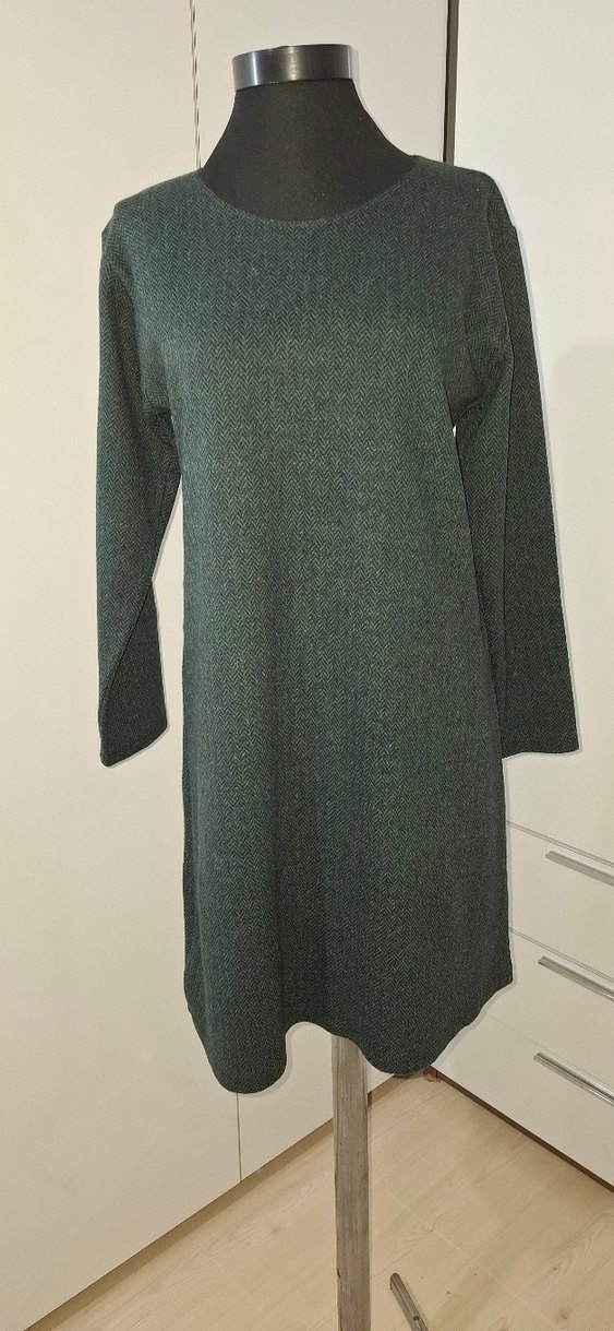 Yeşil yün triko elbise, yuvarlak yaka ve uzun kollu, rahat kesim ve desen içermeyen konforlu tasarımıyla günlük kullanım için uygundur. M-L beden uyumlu.