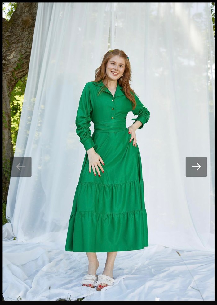 Parlak yeşil renkte, uzun kollu, kayık yaka ve kemerli bel detayına sahip uzun elbisedir. Pürüzsüz sentetik kumaştan üretilmiş, günlük kullanıma uygun rahat kesim bohem tarzda bir elbisedir.