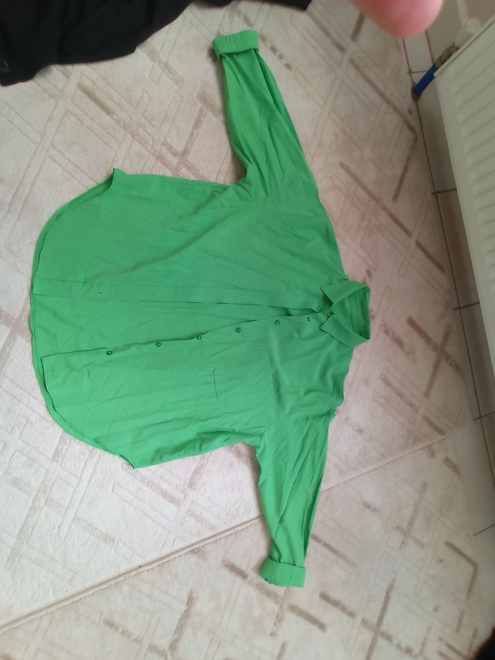 Yeşil keten kumaştan, uzun kollu ve yakalı, bol kesim uzun gömlek. Minimalist ve zahmetsiz şıklık sunar, günlük kullanıma uygundur.