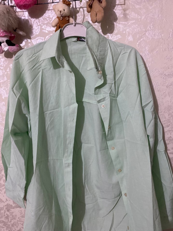 Pastel yeşil, düğmeli gömlek, yakalı ve uzun kolludur. Yumuşak keten kumaştan üretilmiş, bol kesim ve normal midi boyda, günlük sokak modasına uygundur.