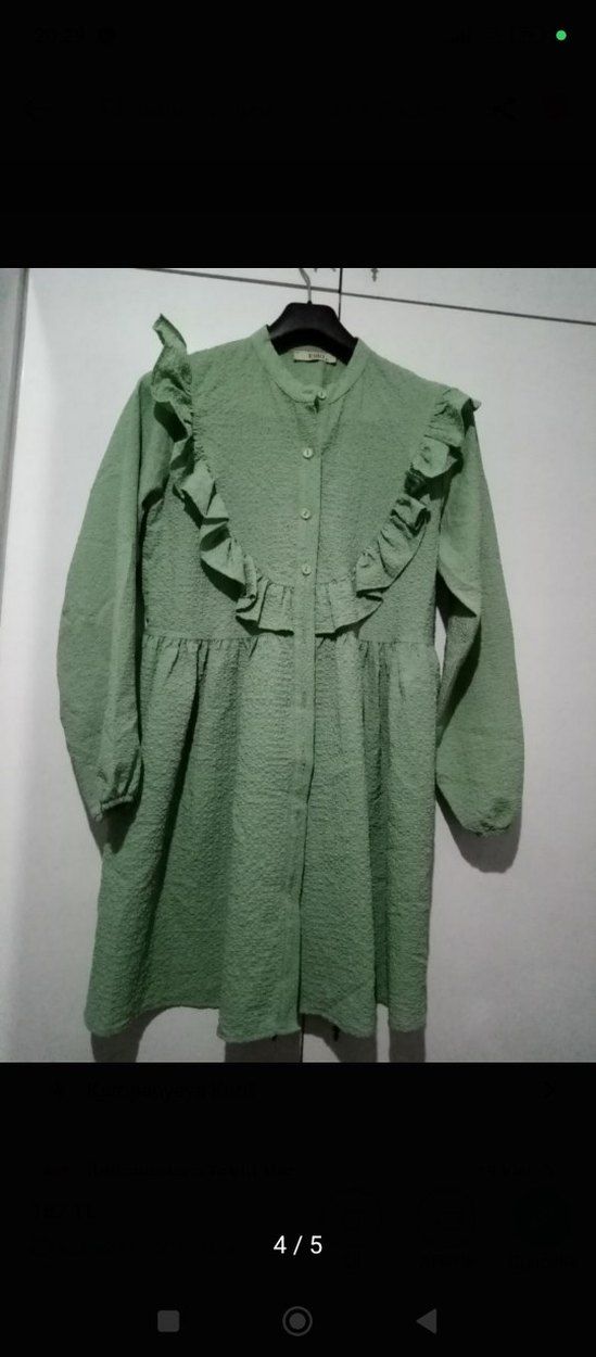 Yumuşak keten kumaştan, yeşil uzun kollu ve bol kesim tunik. Ön kısmında fırfır detayları ve yuvarlak yakası vardır. Minimalist bohem tarzına uygundur.