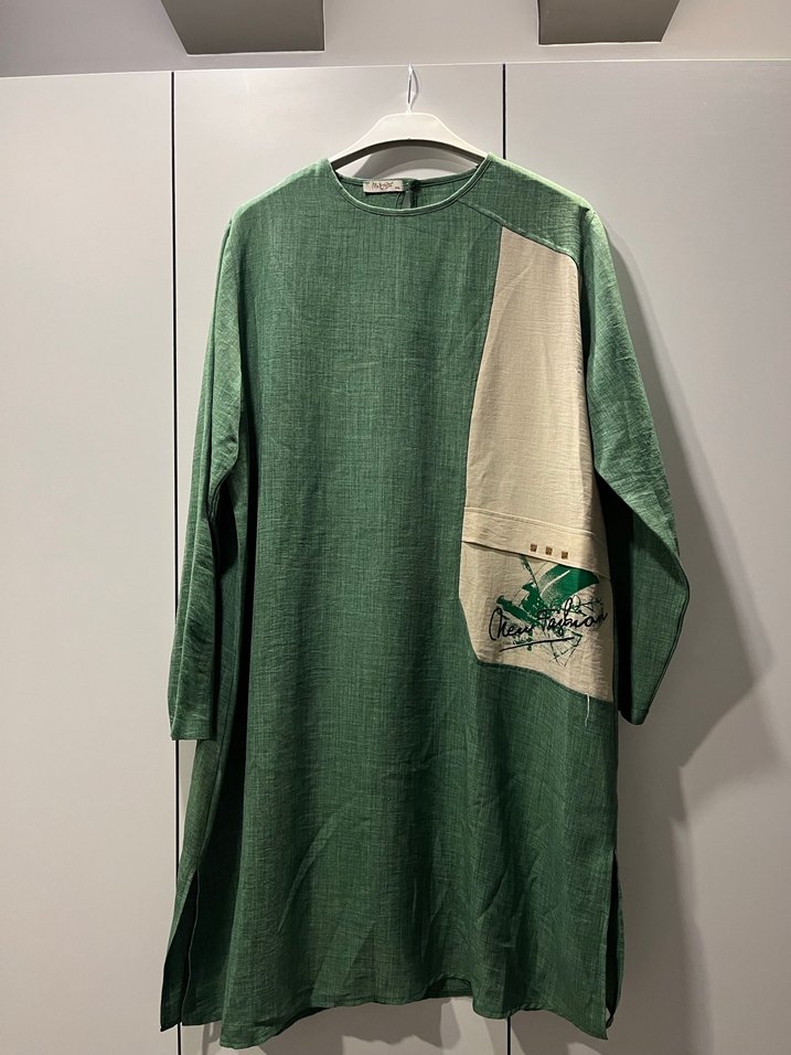Salaş kesim, uzun kollu keten tunik, yuvarlak yakalı, önünde drapeli baskılı detay bulunur.yeşil renk, günlük kullanıma uygundur. Sorunu yok.