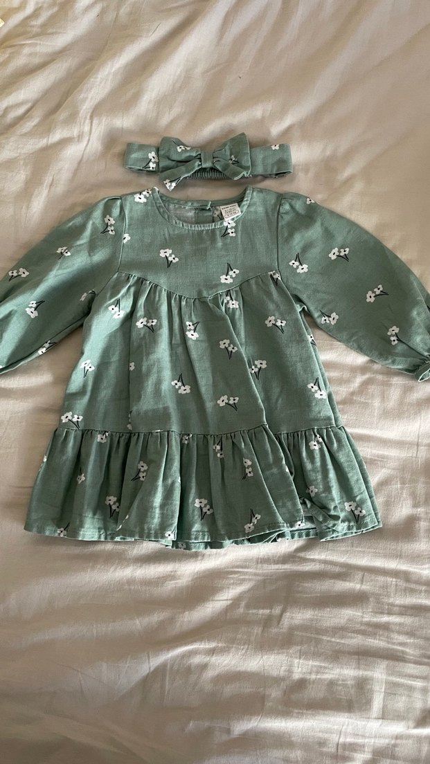 Yeşil renkte, bol kesim kız elbisesi uzun kollu, çiçekli desene sahiptir. Pamuklu yumuşak kumaştan, yuvarlak yakalıdır. Bohem tarzda, uyumlu saç bandı ile birlikte.