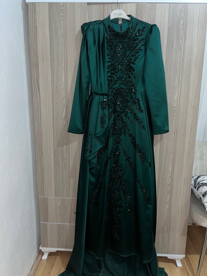 Koyu yeşil, uzun kollu ve yüksek yakalı bu abiye elbise, nakışlı desenleri ve drapeli detayıyla hem mütevazı hem şık bir görünüm sunar. Düğünler için uygundur.