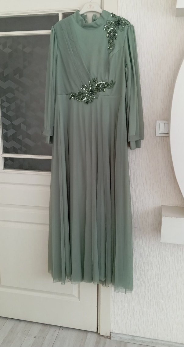 Yeşil Uzun Kollu Nakışlı Kadın Abiye Elbise