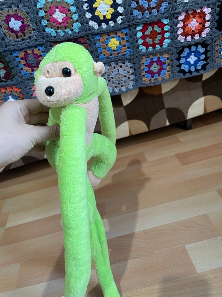 Canlı yeşil renkte, uzun kollu ve yumuşak dokulu peluş maymun oyuncak, sevimli yüz ifadesiyle dikkat çekiyor.