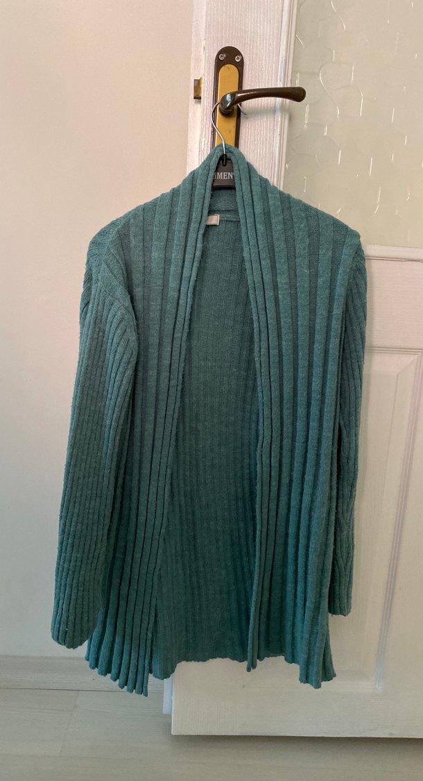Yeşil renkte, uzun kollu, yüksek yakalı, pileli detaylı ve bol kesim triko kadın hırka. Normal midi boyda, sade ve rahat kullanıma uygun.