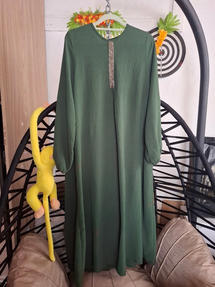 Koyu yeşil renkte, uzun kollu ve yüksek yakalı uzun elbise. Pilili detaylara sahip, bol kesim ve yumuşak sentetik kumaştan üretilmiştir. Günlük kullanım için uygundur.