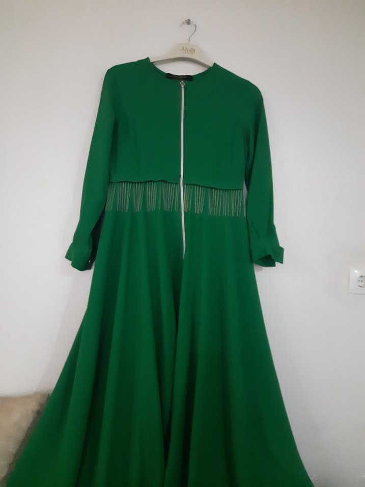 Bol kesim, parlak yeşil uzun elbise, uzun kollu, yuvarlak yaka ve pilili detaylara sahip, bohem ve avangard tarzda.