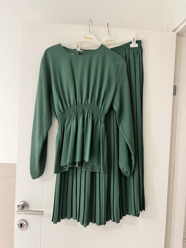 Kadınlar için uzun kollu, piliseli etekli, regular fit, koyu yeşil renkte sentetik kumaştan modern klasik tarzda elbise.