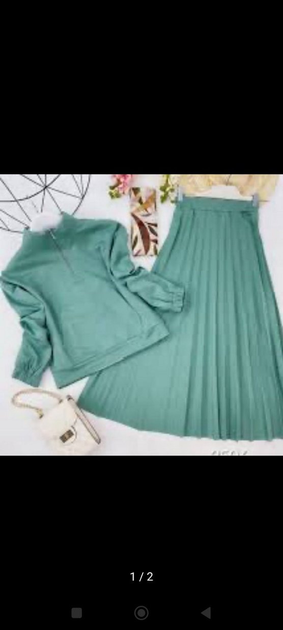 Yeşil, uzun kollu, yüksek yakalı ve pliseli tasarıma sahip kadın kumaştan üretilmiş, rahat kesimlidir ve günlük sokak tarzına uygundur. Pastel tonlarda ve desensizdir.