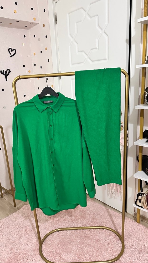Parlak yeşil renkte, keten kumaştan yapılmış, uzun kollu ve pliseli, normal kesim kadın takımı. Ofis için uygundur.