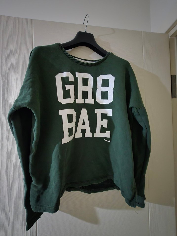 Yumuşak kürklü kumaştan, uzun kollu, yuvarlak yaka, bol kesim, baskılı yeşil sweatshirt. Spor ve rahat sokak stili için uygundur.