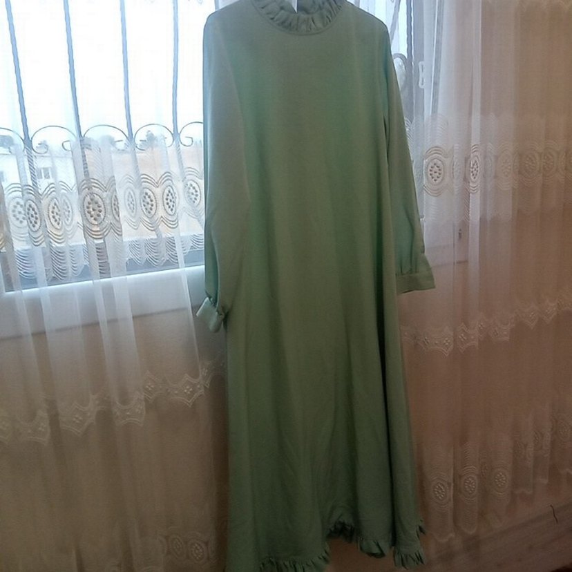 Pastel yeşil uzun elbise, salaş kesim ve drapeli detaylara sahiptir. Uzun kollu, yumuşak ve sıcak kumaştan, yuvarlak yakalı ve sade tasarımlıdır. Günlük rahat kullanım için uygundur.