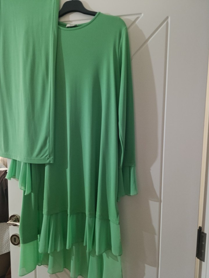 Yeşil renkte, uzun kollu ve salaş kesim kadın elbisesi. Drapeli detayları ve yuvarlak yaka tasarımıyla günlük kullanıma uygun, sade ve şık bir modeldir.