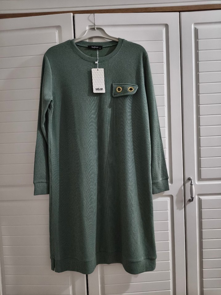 Yeşil renkte, uzun kollu, salaş kesim kadın tunik. Yuvarlak yakalı olup, yumuşak ve sıcak kumaştan üretilmiştir.