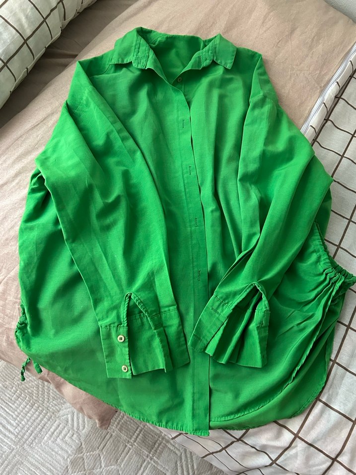 Uzun kesim, yeşil keten gömlek, salaş ve parlak yapısıyla, uzun kollu ve V yaka detaylıdır. Sokak stiline uygun şık bir tasarımdır. Yanları Büzgülü ayarlanabilir