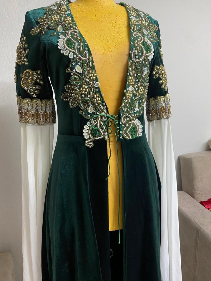 Diger markanın yeşil renkli, uzun ve drapeli kollu, nakış işlemeli, notched lapel yakalı, oturan kesimli kadın hint elbisesi. Bohem ve retro düğünler için uygundur.