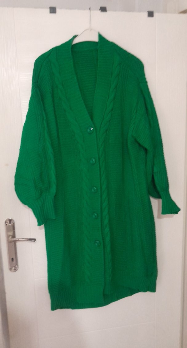 Yeşil renkte, uzun boy örgü kadın hırka. Notlu yaka ve uzun kollu, bol kesim rahat bir sokak stili sunar.