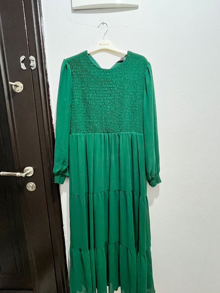 Yeşil uzun elbise, pilili etek, uzun kollu ve yuvarlak yakalıdır. Bol kesimi ve bohem tarzıyla dikkat çeker.