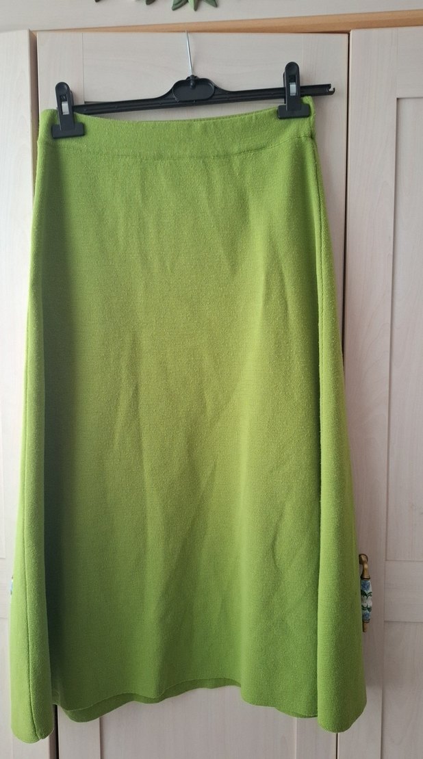 Yeşil uzun, salaş kesimli, drapeli, parlak ve düz görünümlü, yumuşak ve sıcak kumaştan kadın eteği. Günlük kullanım için uygundur.